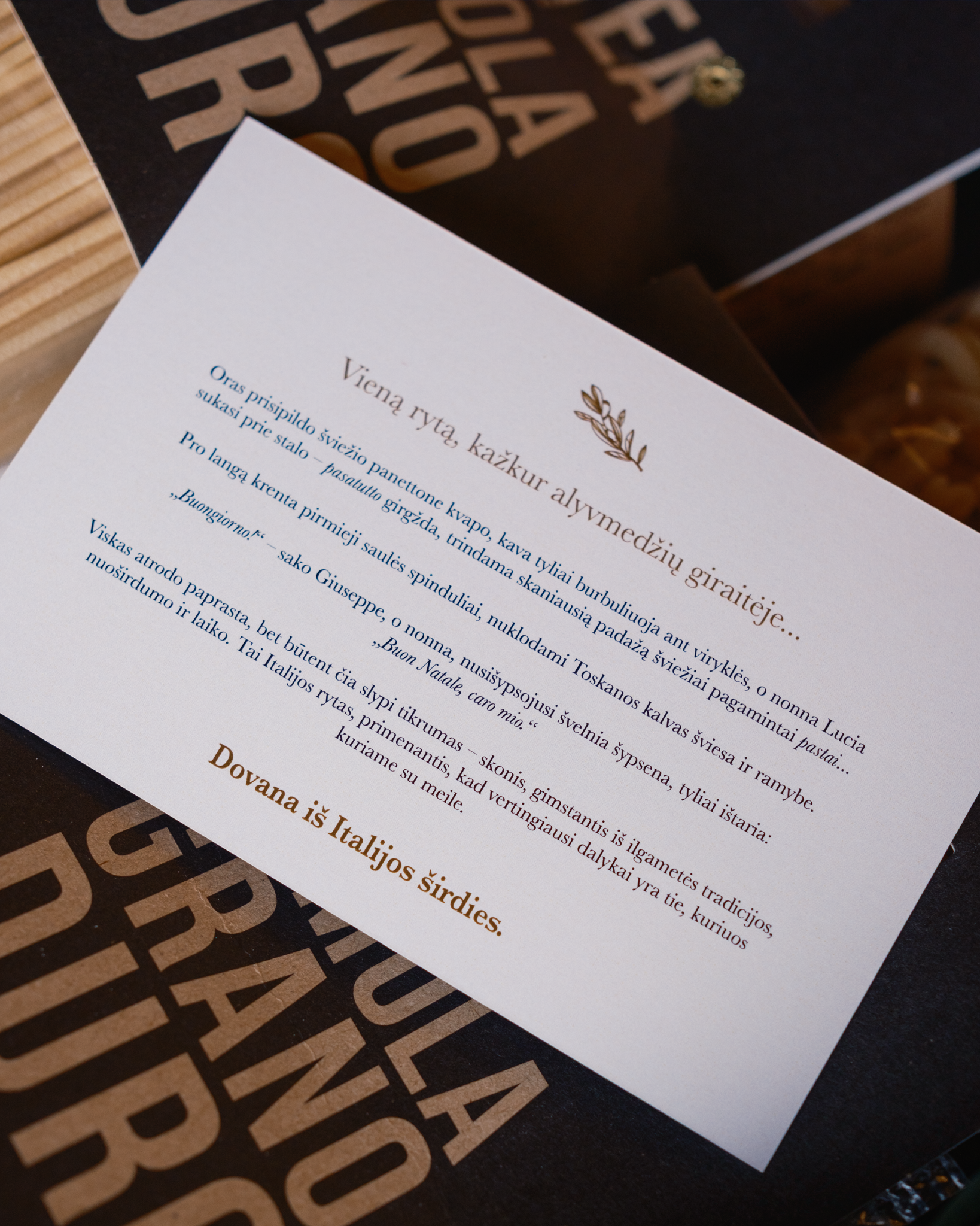 Elegantišką dovanų dėžę su rafinuotu itališku dizainu ir išskirtine istorijos kortele.